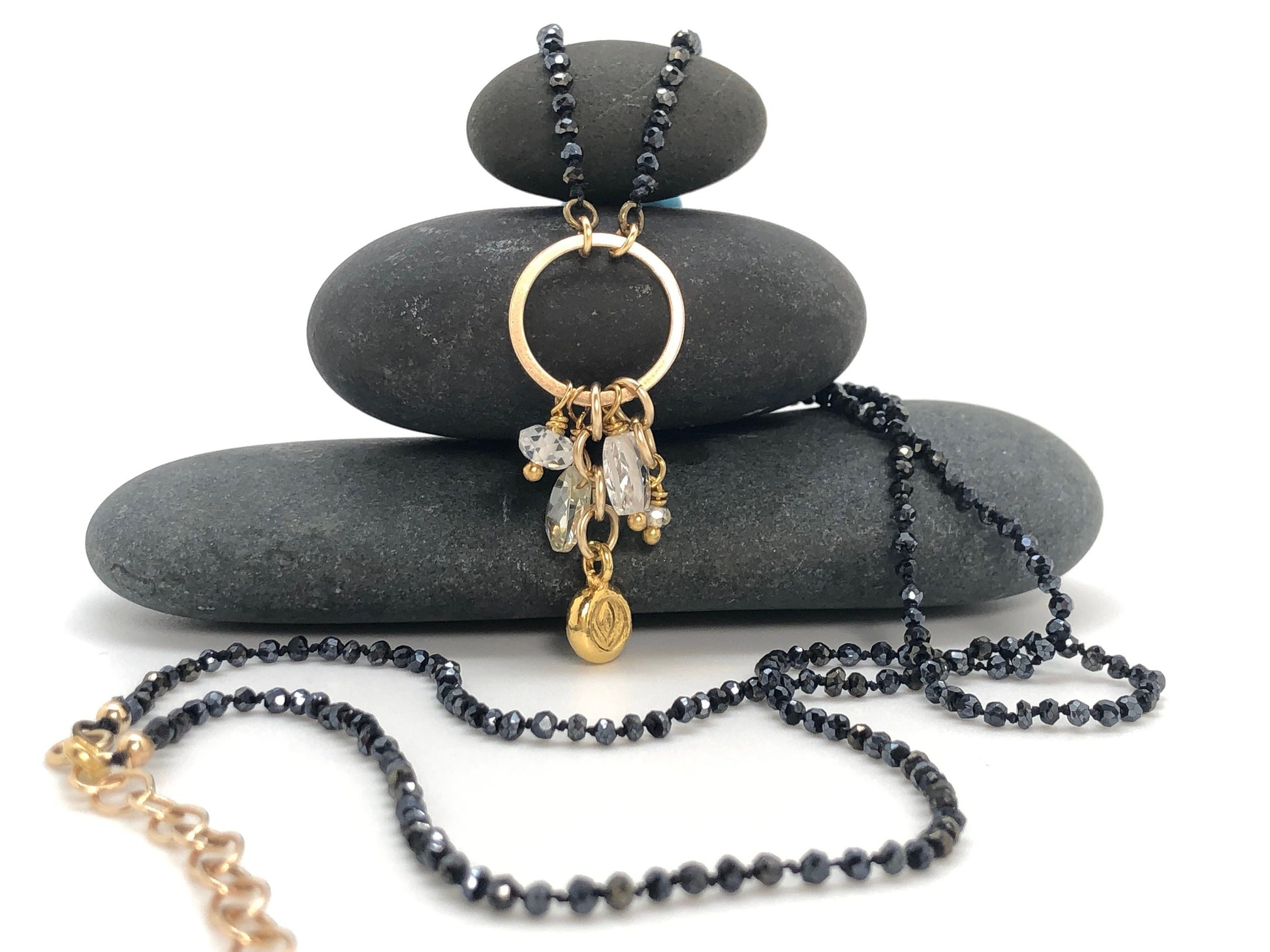 Dream Necklaces are meant to remind one to dream big and keep dreaming. Tiny faceted, black spinel beads are hand knotted on black. Charms and gemstones dangle from a gold ring.