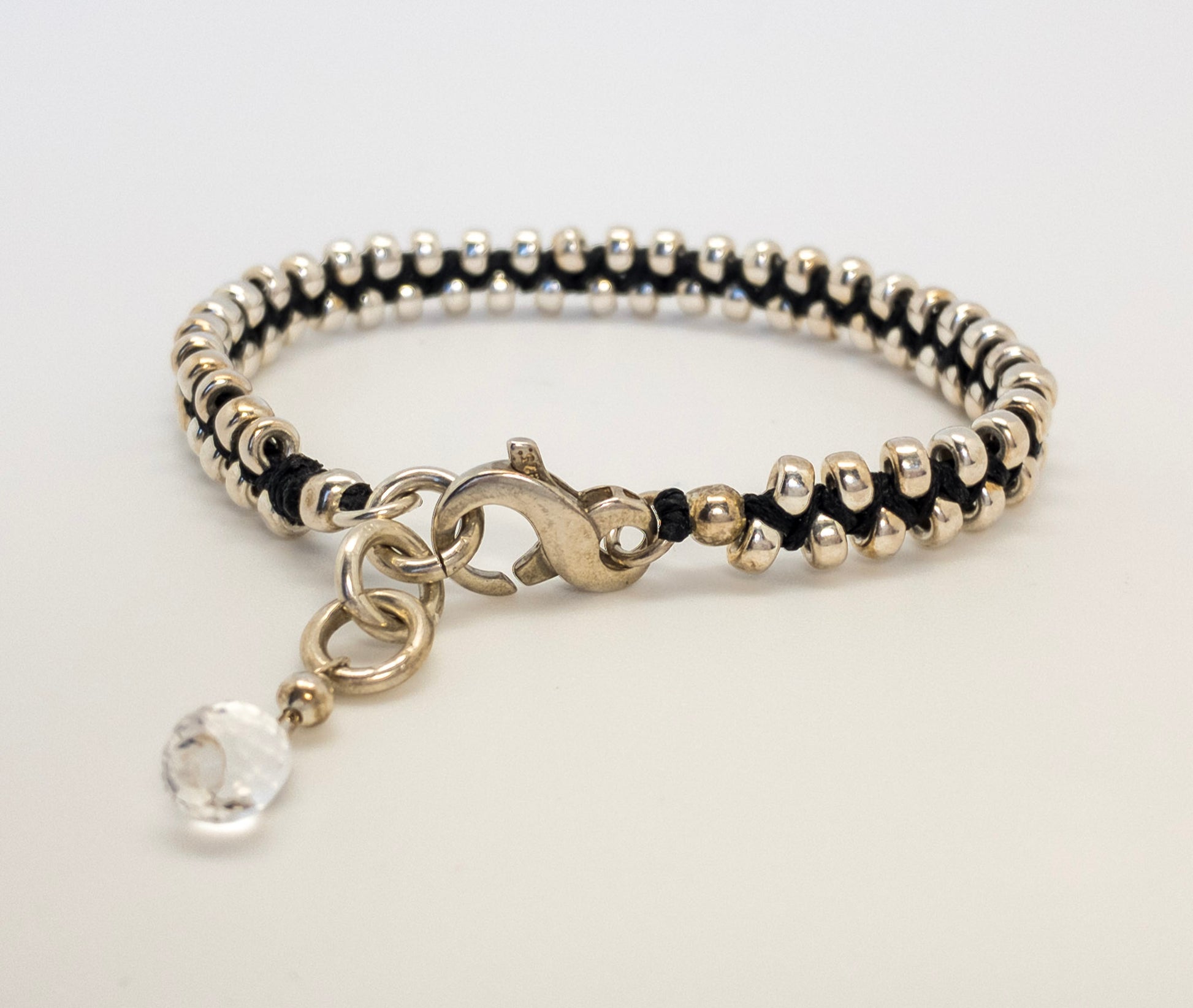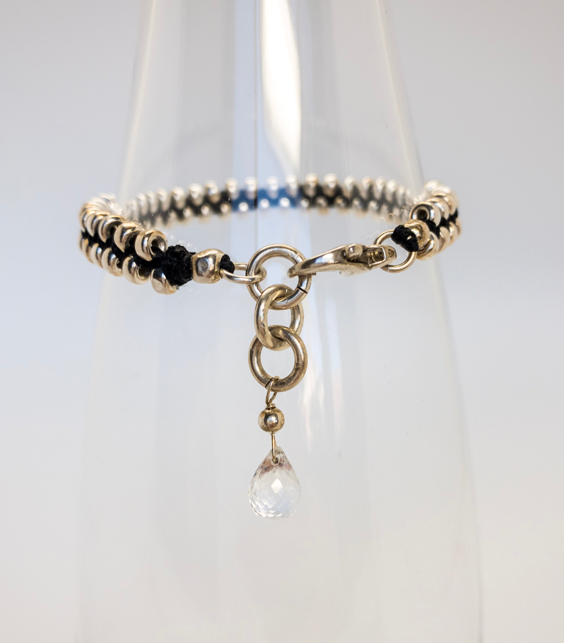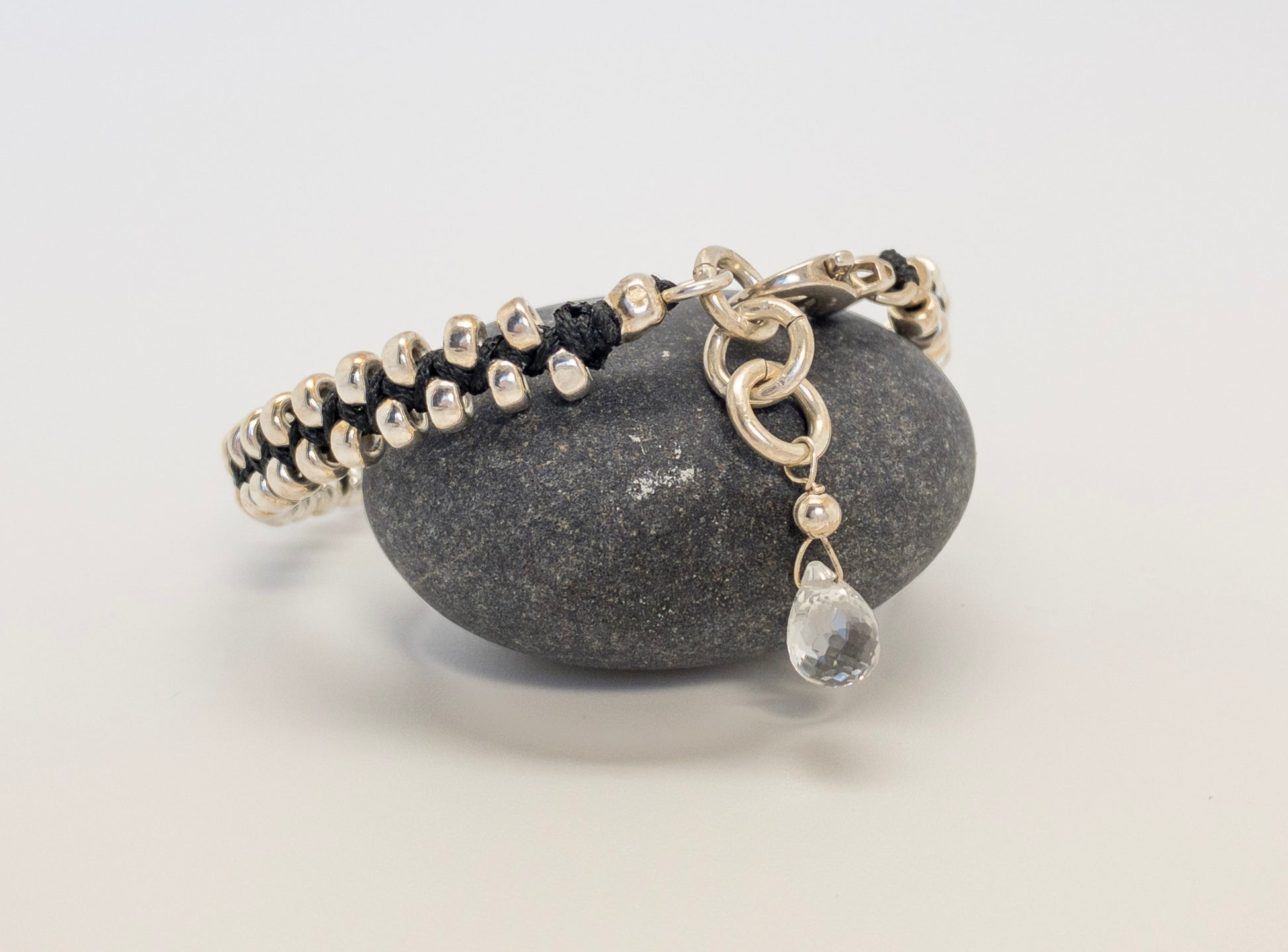 Large sterling silver beads are hand woven on black jewelry cord with chunky sterling lobster clasp. A beautifully cut clear quartz drop dangles from silver rings.