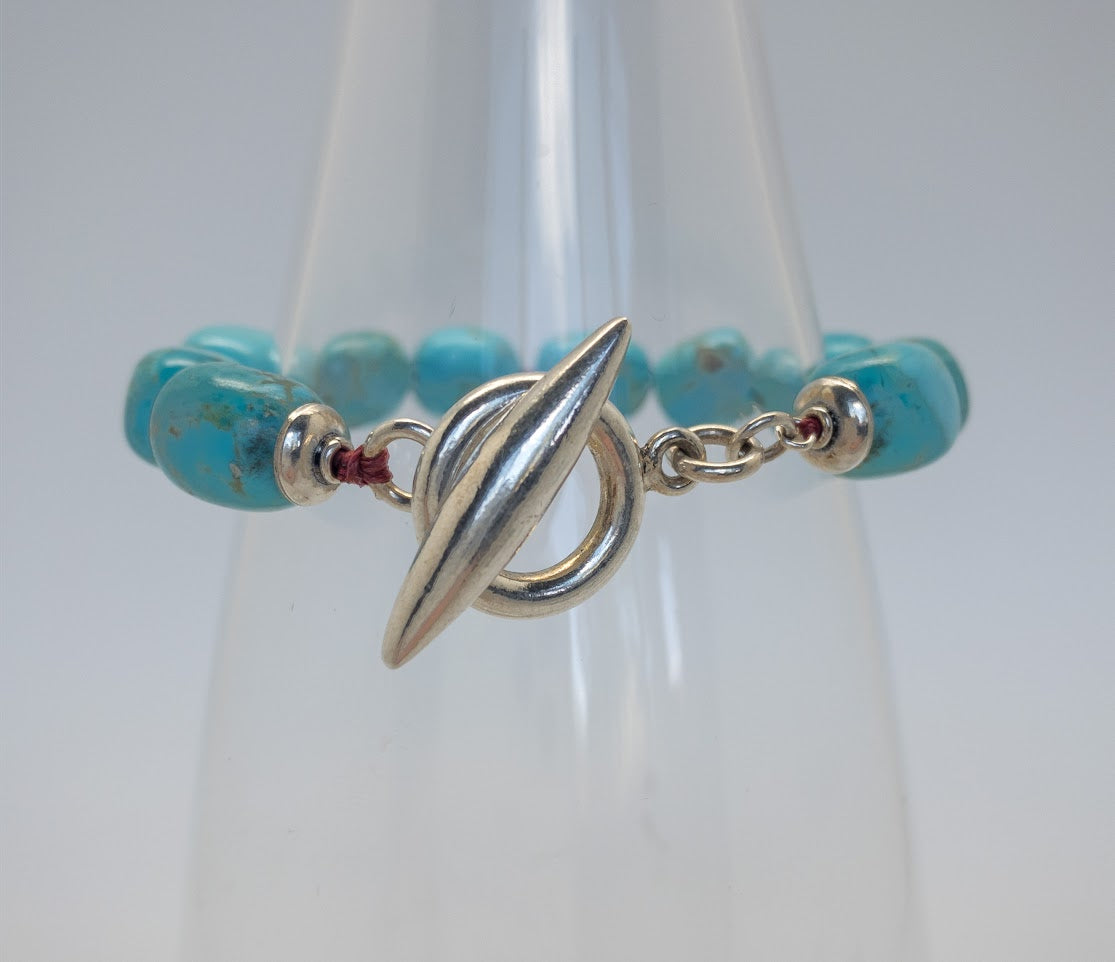 Handcrafted with hefty turquoise beads mined in Kingman, Arizona, this bracelet showcases the striking sky-blue color that turquoise is known for. Each bead is carefully hand-knotted onto red cord, with a chunky sterling silver toggle clasp completing the design.