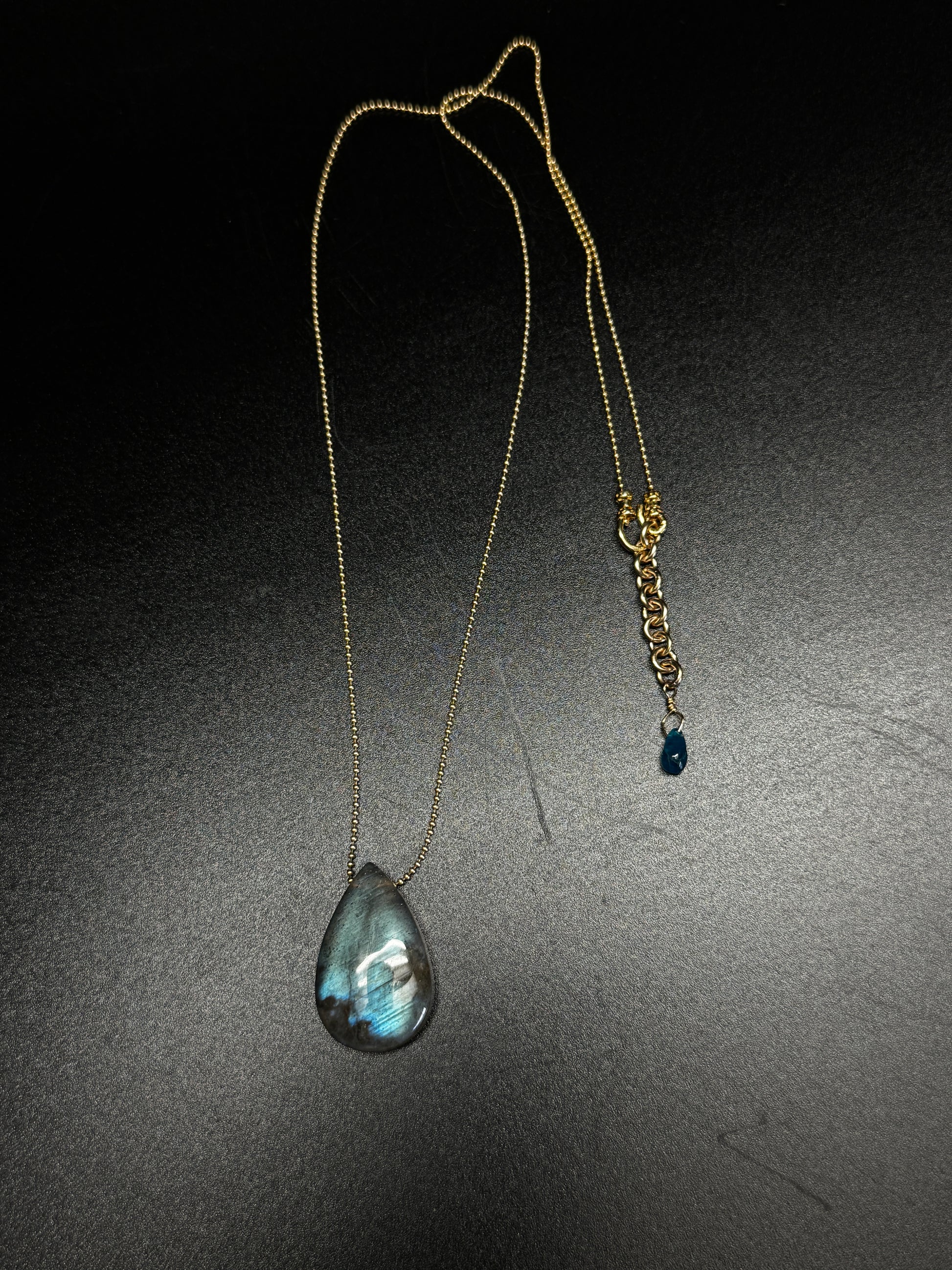 - Materials: 14k gold-filled chain, Labradorite teardrop pendant, Apatite drop