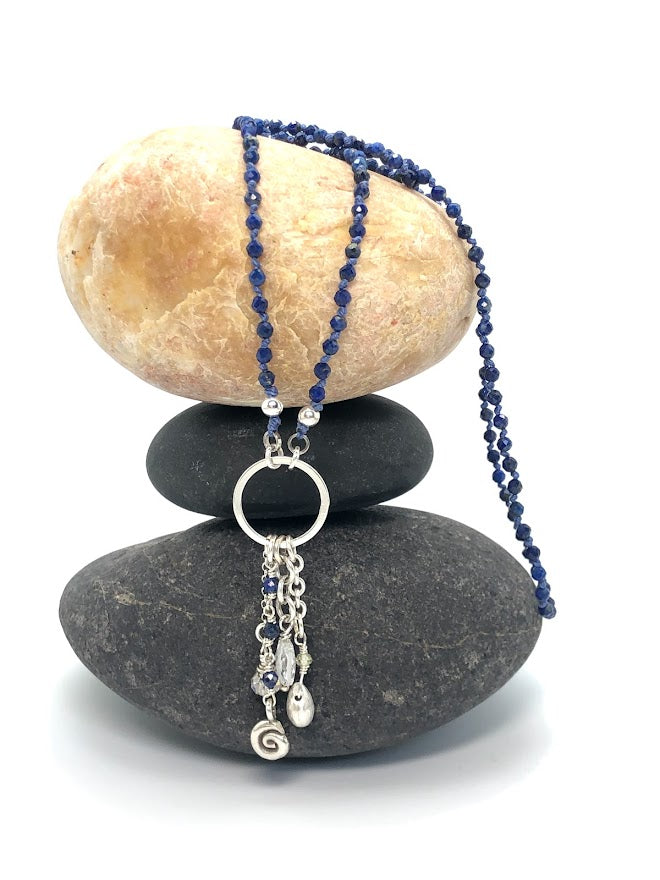 Reminiscent of the deep blue in the evening sky, Blue Lapis can offer psychic protection, bringing deep peace and harmony. Faceted, Blue Lapis beads are hand-knotted on black cord