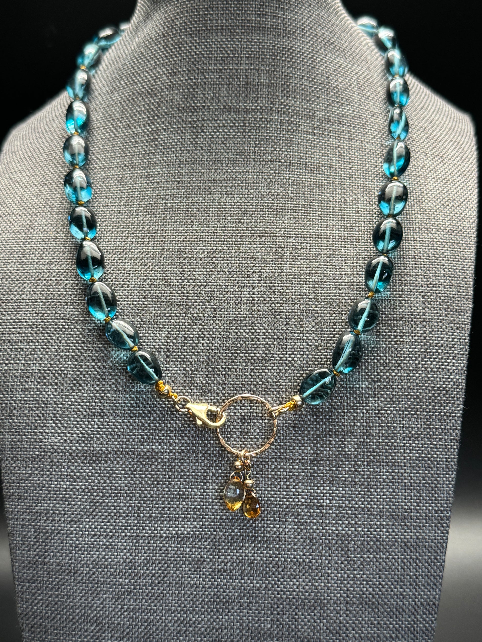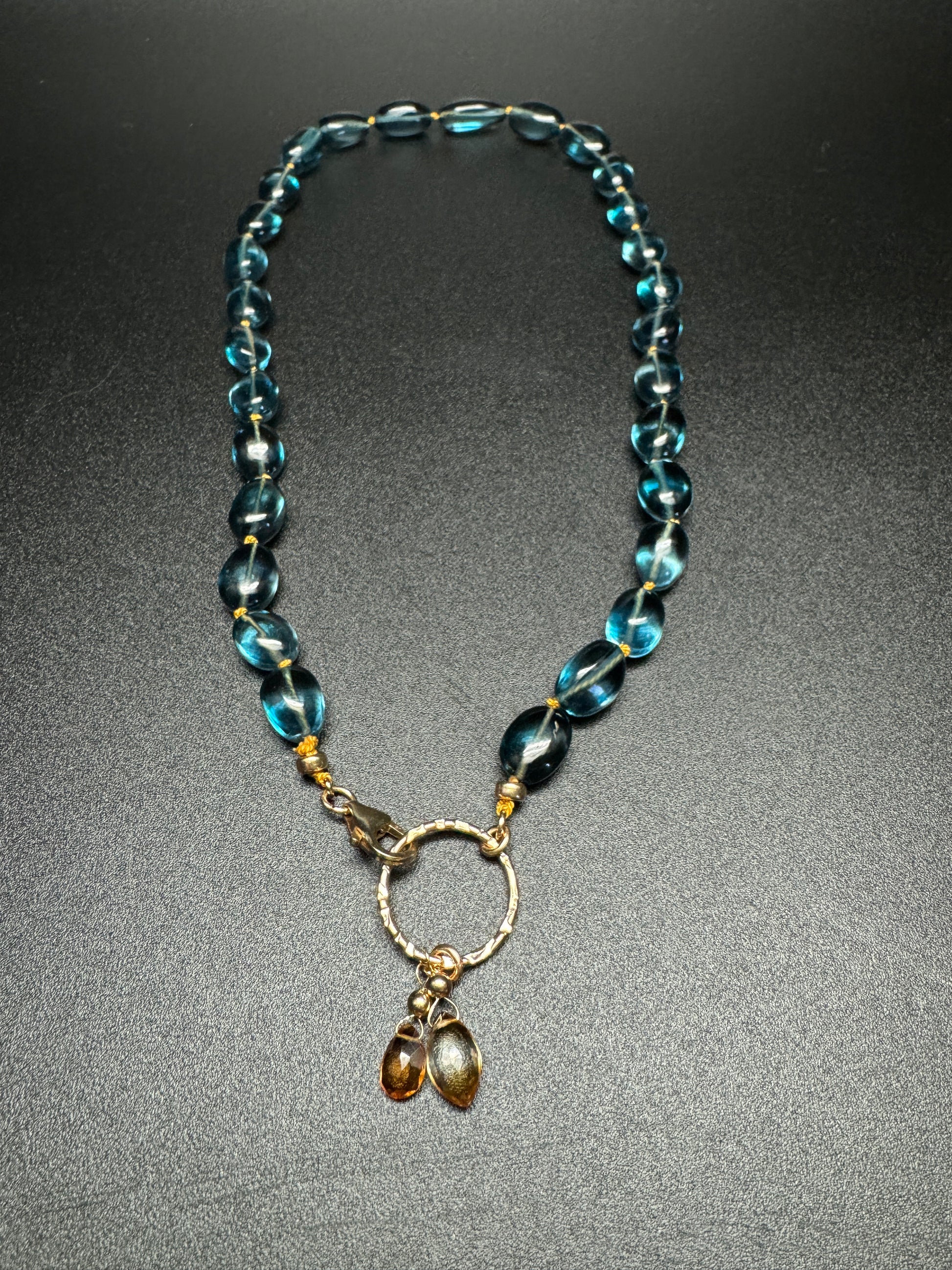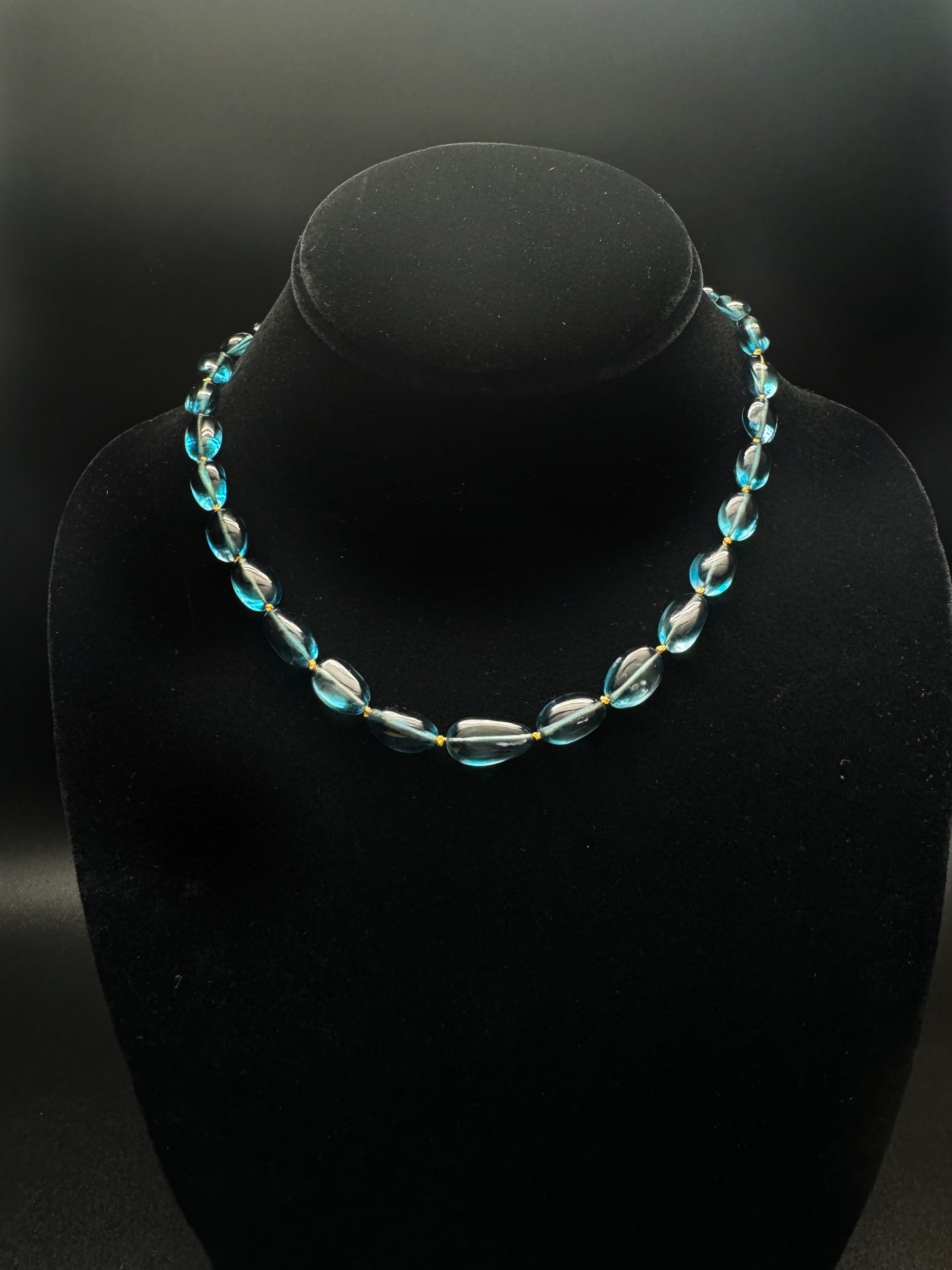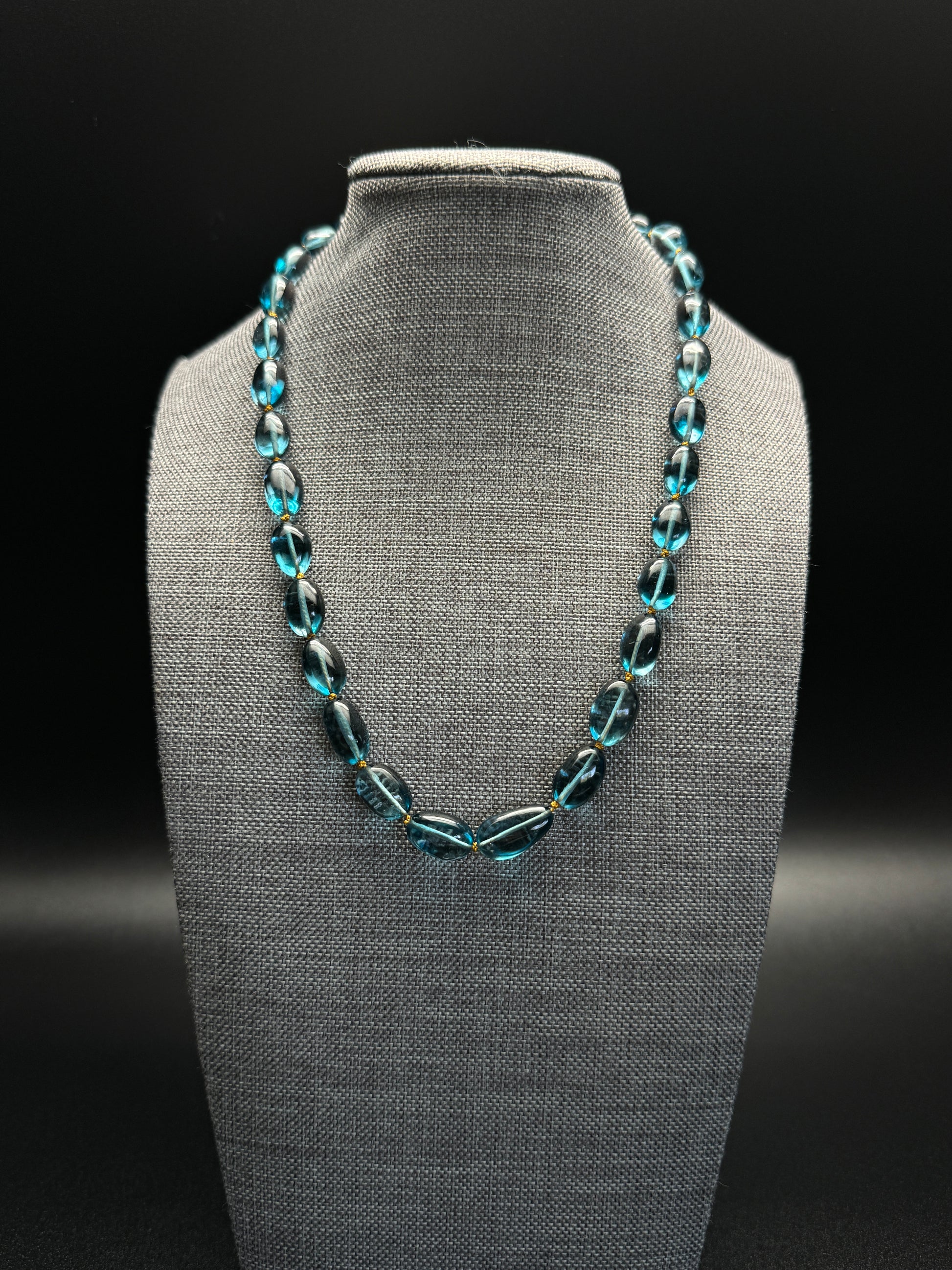 Discover the ultimate in sophistication with this beautifully handcrafted London Blue Topaz necklace. Featuring graduated London Blue Topaz beads meticulously hand-knotted on a rich mustard-colored cord, this piece effortlessly blends vibrant color with timeless elegance. The unique cut and size of each bead create a stunning visual impact, gracefully transitioning from small to larger beads, giving it a captivating, fluid design.