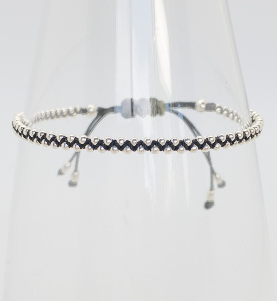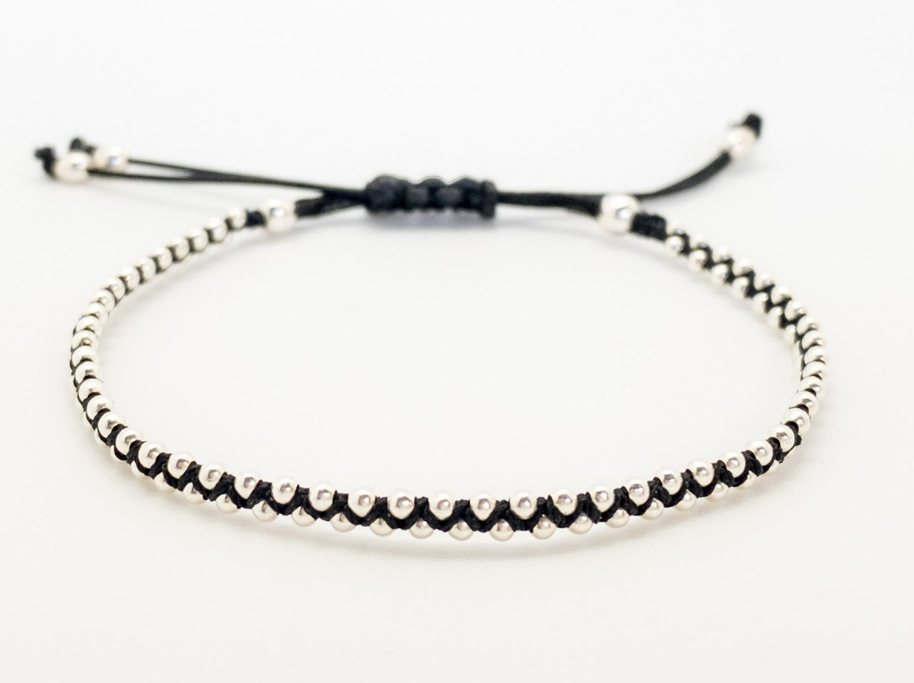 Delicate sterling silver beads are meticulously woven onto black faux leather, creating a simple yet elegant design. With an adjustable closure, this bracelet offers a perfect fit, and its timeless style is one you'll never want to take off.
