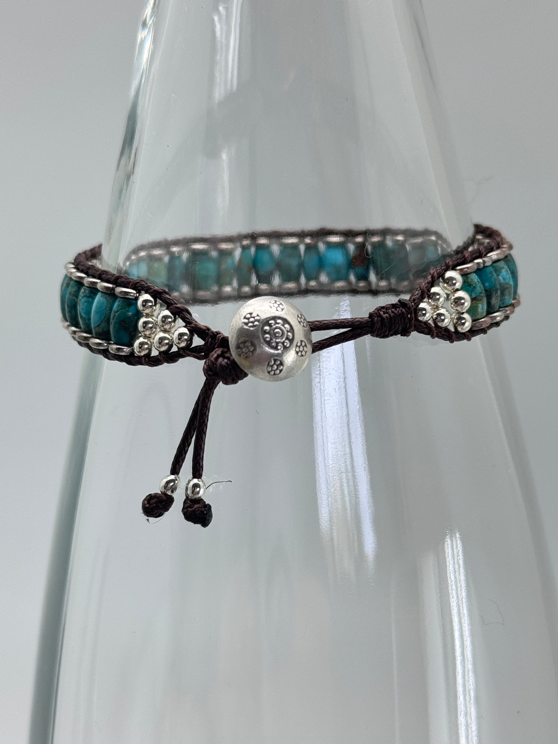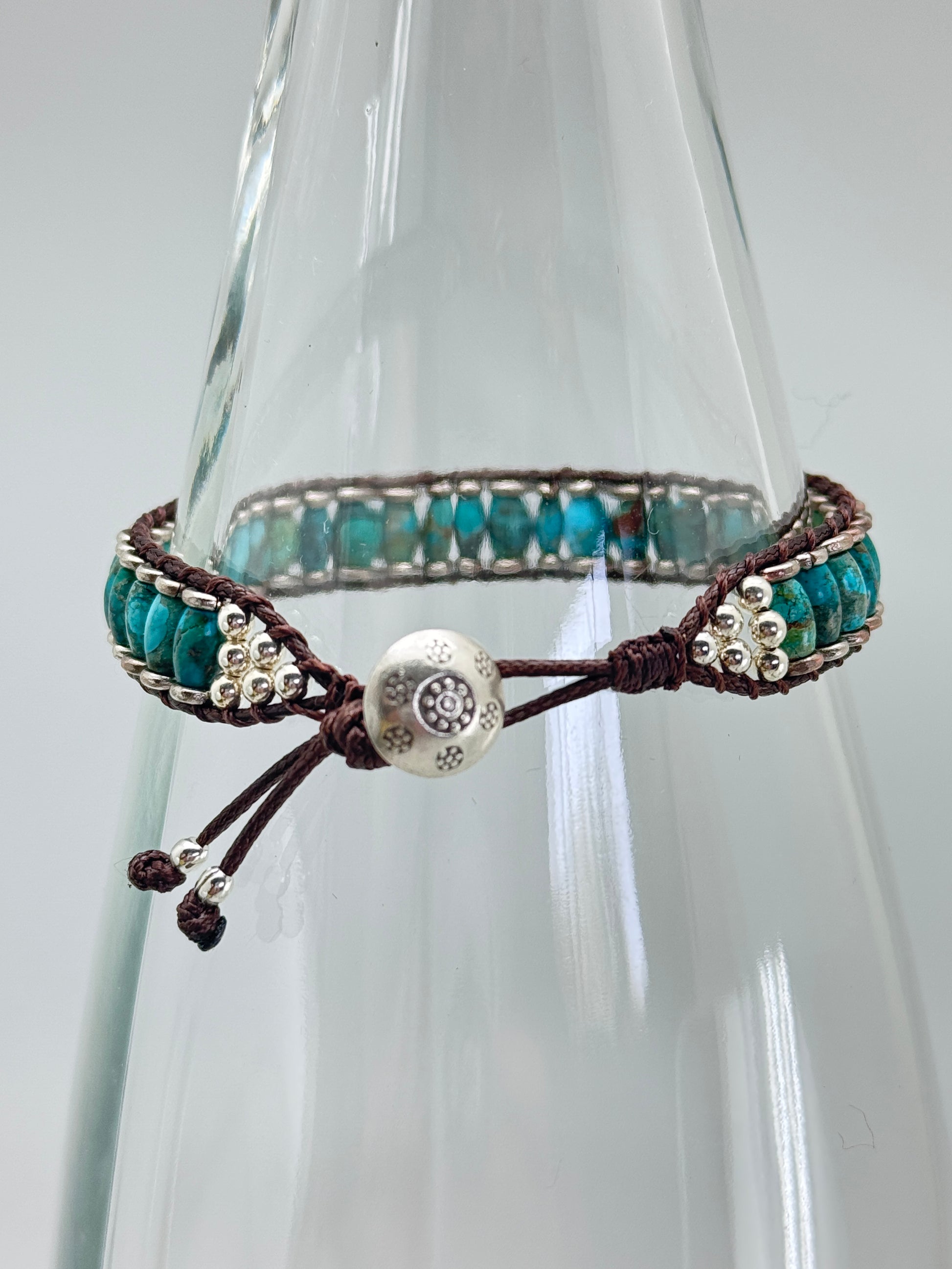Turquoise and silver heishe beads are hand woven on chocolate leather. A silver Hill Tribe button is the enclosure.
