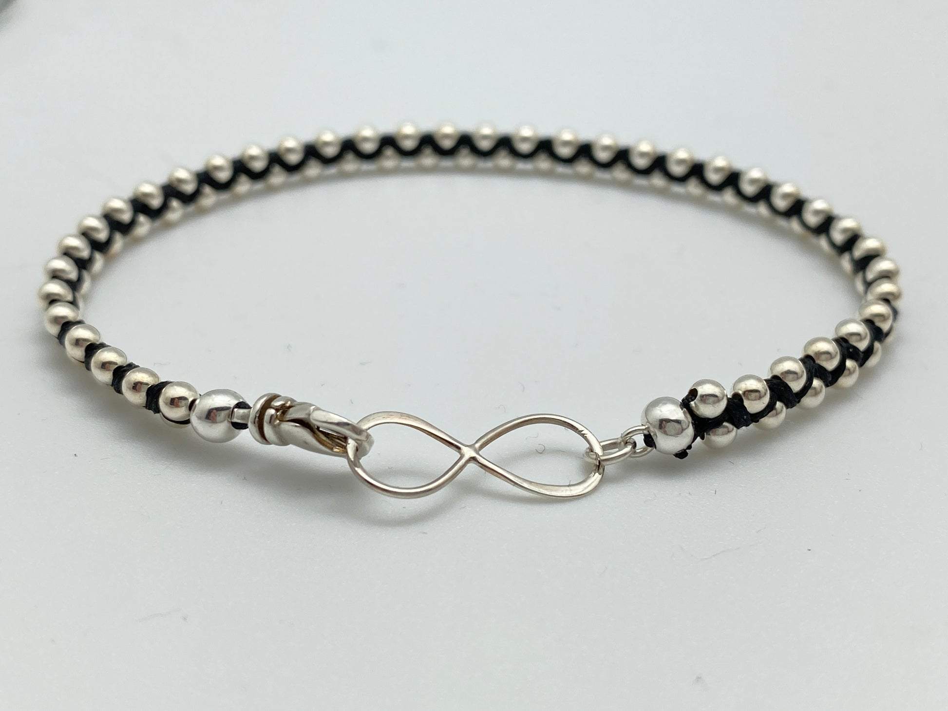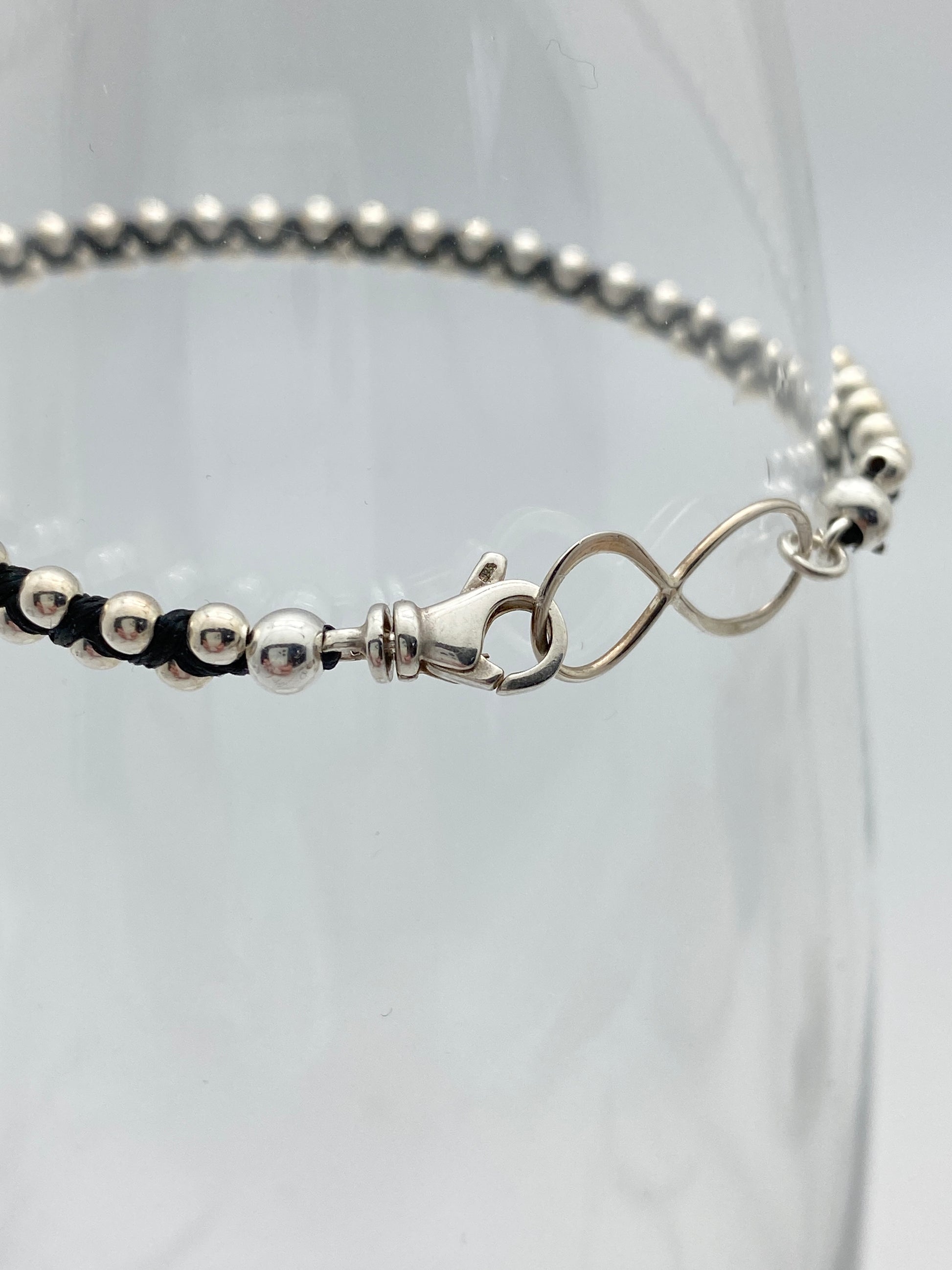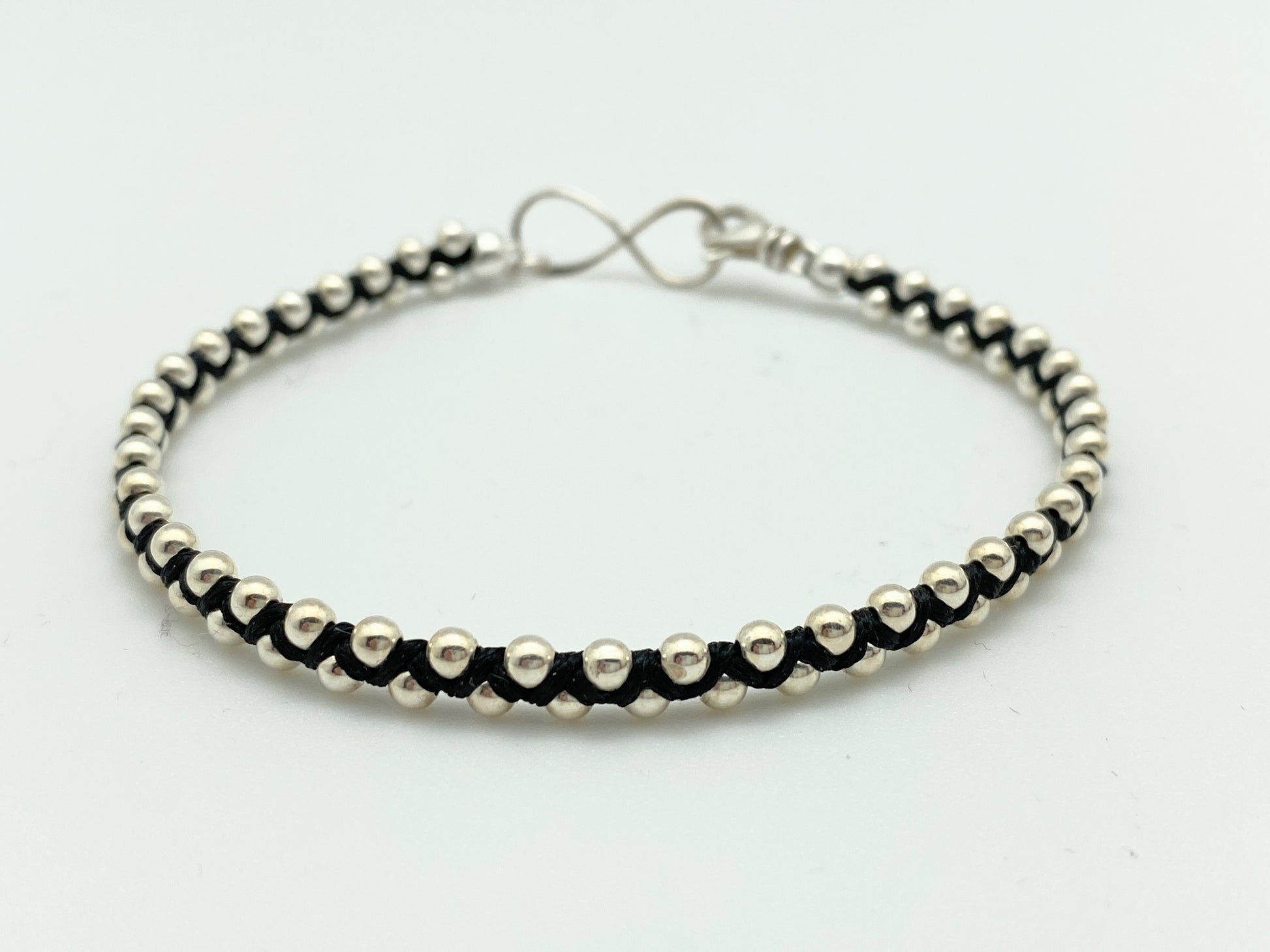 This elegant bracelet features handwoven sterling silver beads on a sturdy black jewelry cord, designed to be both durable and stylish. Its sleek design makes it perfect for everyday wear and stacking with other bracelets, adding a meaningful touch to your collection.