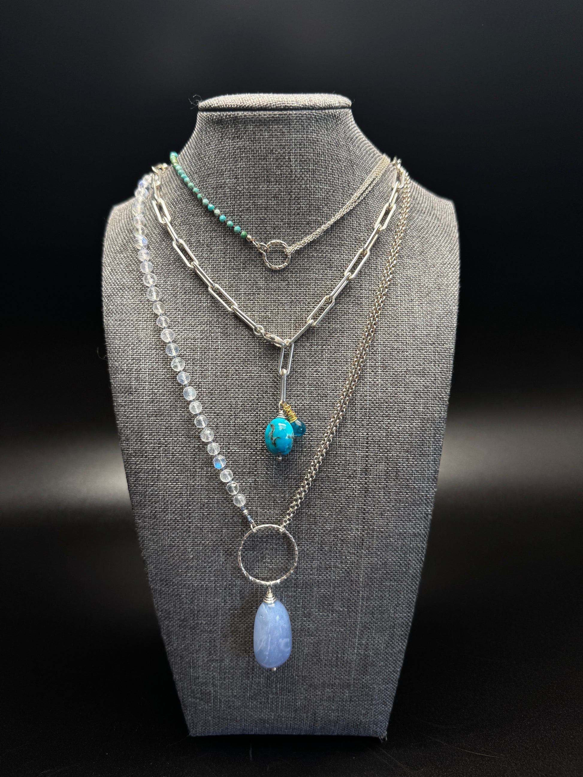 The two energies come together at the center with a hammered sterling silver ring, while a Blue Chalcedony nugget rests directly over the Heart Chakra, reminding you to stay balanced and connected with your heartβs true energy.